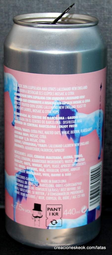 APRICOTS es el resultado de la unión de los talentos de la barcelonesa Garage Beer Co. y la sueca Brewski. En esta elaboración se nota la especialidad de ambas casas, dado que tenemos una IPA turbia o NEIPA con fruta. Se trata de una Imperial IPA con albaricoque. Se presenta de un color dorado, casi de color piel de albaricoque. Es una cerveza realmente turbia, debido al uso de trigo y avena y de la levadura New England de Lallemand. En esta cerveza se logra claramente imitar por sabor y textura los zumos de frutas a los que tanto se asemejan las NEIPA. Además del albaricoque, son los lúpulos Mosaic y Citra los que dan ese perfil frutal.